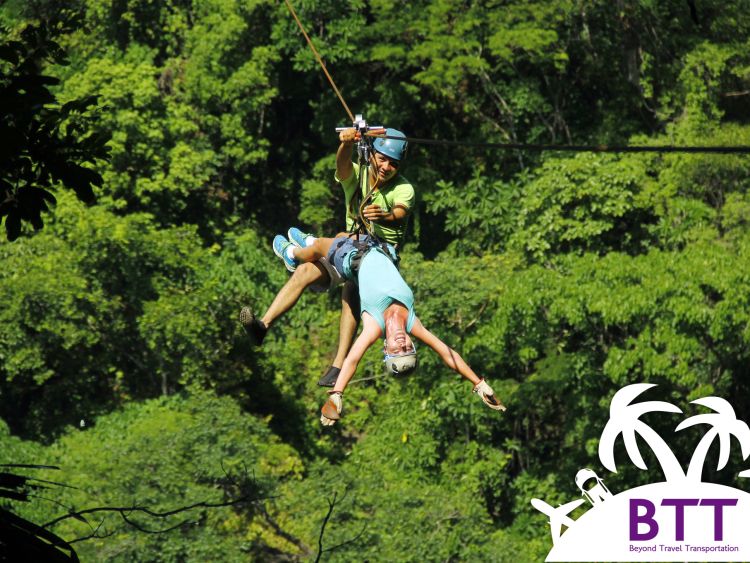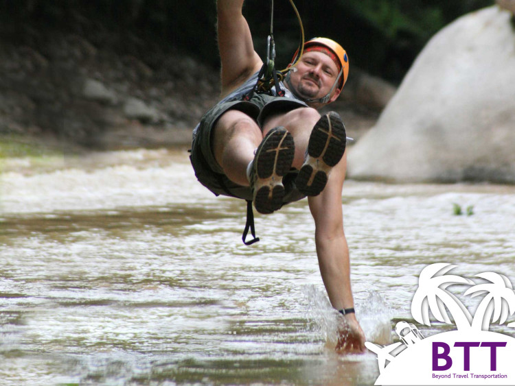 Aventura sin límites comienza al atravesar montaña a montaña en tirolesas sobre el río, combinadas con brechas de puentes colgantes, líneas movedizas y grandes brincos de acción.